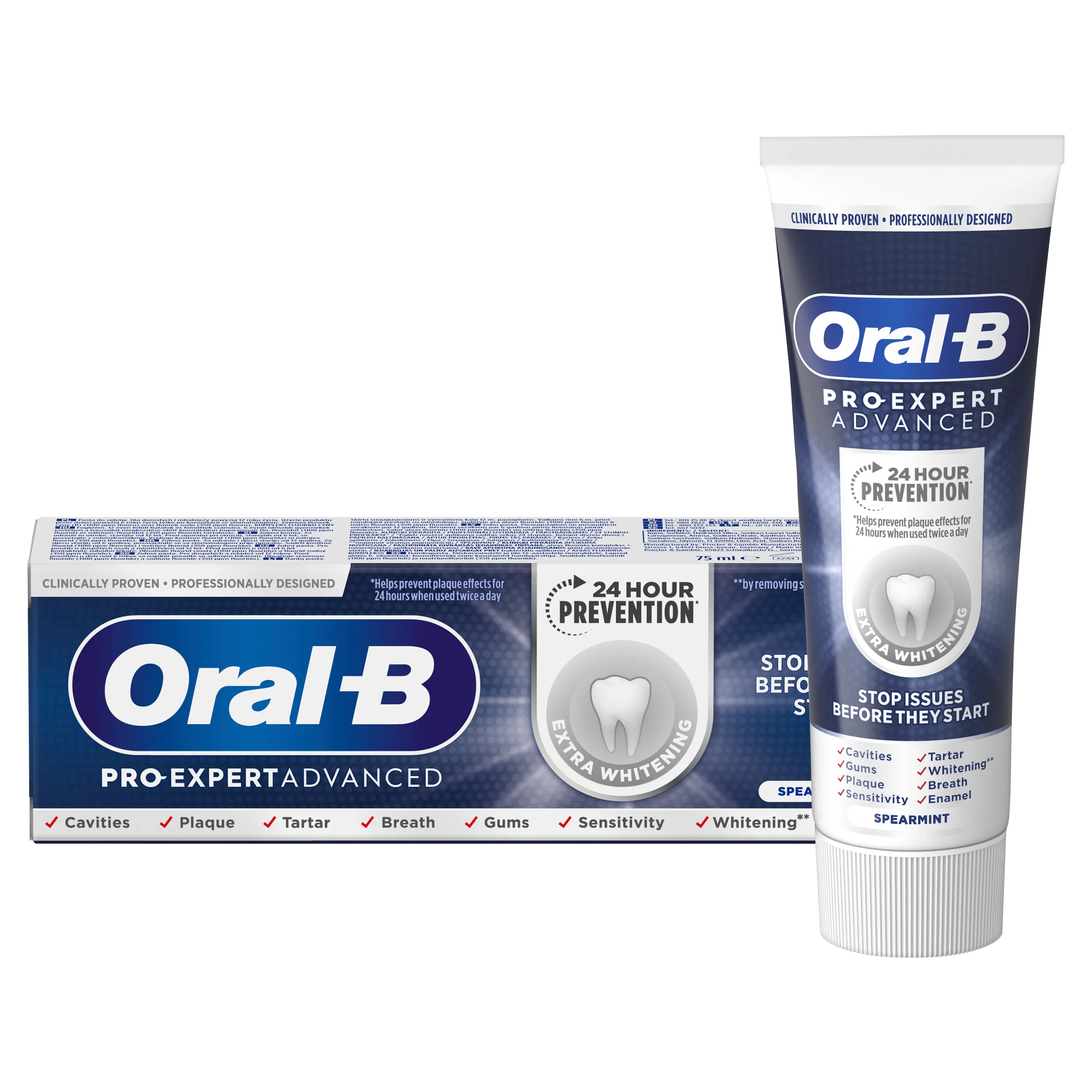 Skuteczność opracowanej przez profesjonalistów pasty do zębów Oral-B Pro-Expert Advance Science została dowiedziona klinicznie: zapobiega problemom, zanim się pojawią, i pomaga chronić przed płytką bakteryjną oraz jej przywieraniu do zębów i dziąseł przez 24 godziny przy szczotkowaniu dwa razy dziennie.
