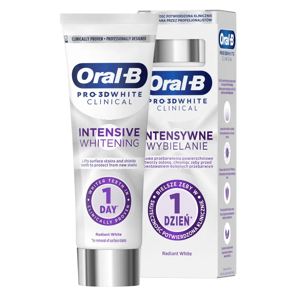 Dowiedziono klinicznie, że pasta do zębów Oral-B Pro 3D White Clinical Intensive Whitening wybiela zęby, usuwając przebarwienia powierzchniowe już od 1.