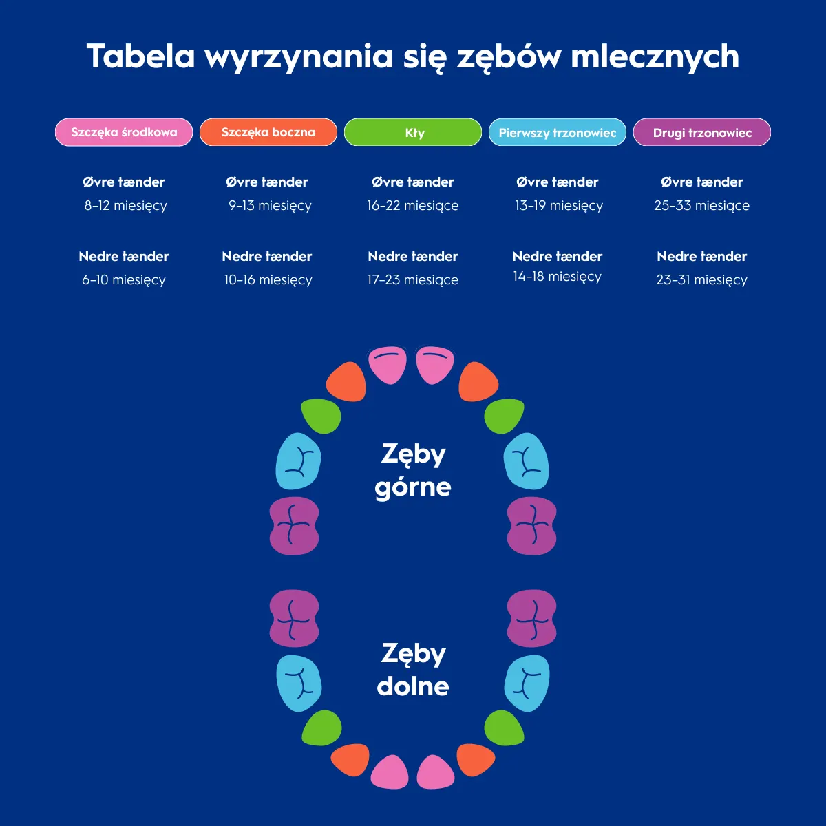 Pierwsze zęby dziecka, czyli mleczne zęby, zwykle zaczynają wyrzynać się w wieku od 6 do 31 miesięcy.